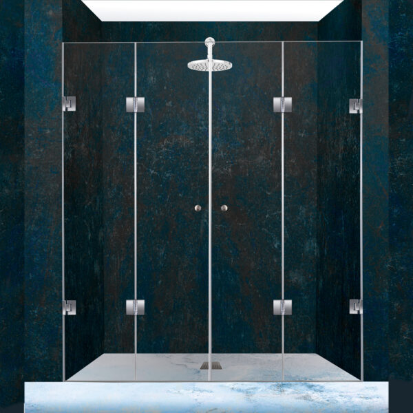 מקלחון חזית שתי דפנות קבועות ודלת שנפתחת באמצע פנימה והחוצה עד 90 מעלות. מראה נקי