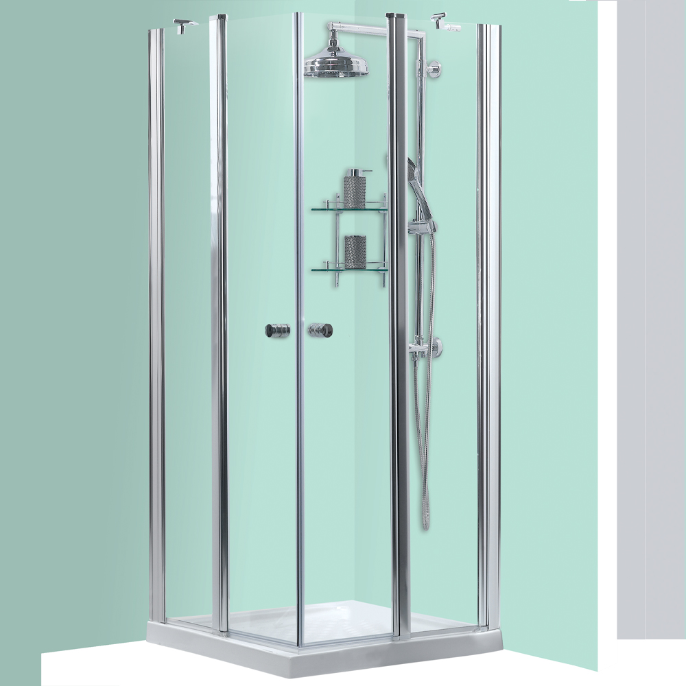 מקלחון פינתי פרופילים- שני הצדדים כוללים דופן קבועה בשילוב דלת הנפתחת פנימה / החוצה עד 90 מעלות.