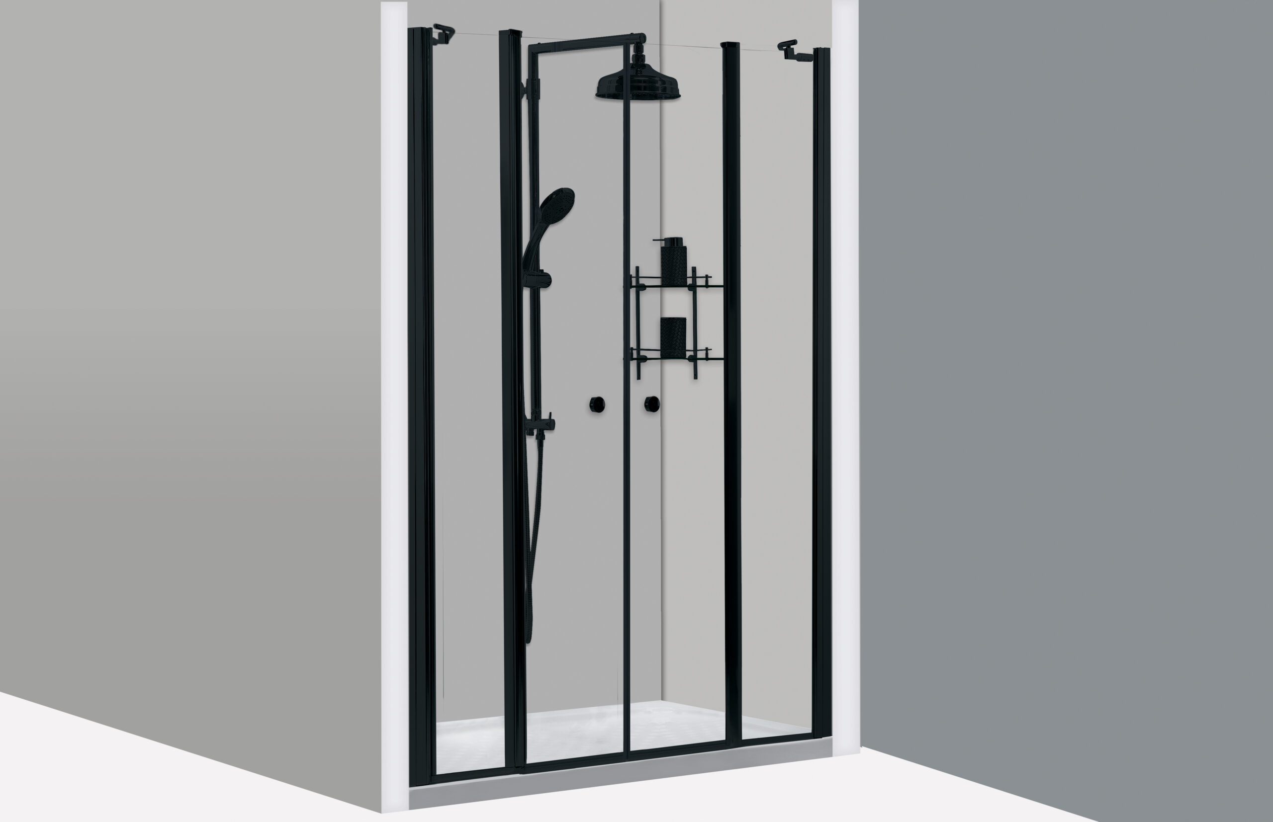 מקלחון חזית black model פרופילים- 2 דפנות קבועות ו2 דלותות נפתחות פנימה והחוצה.