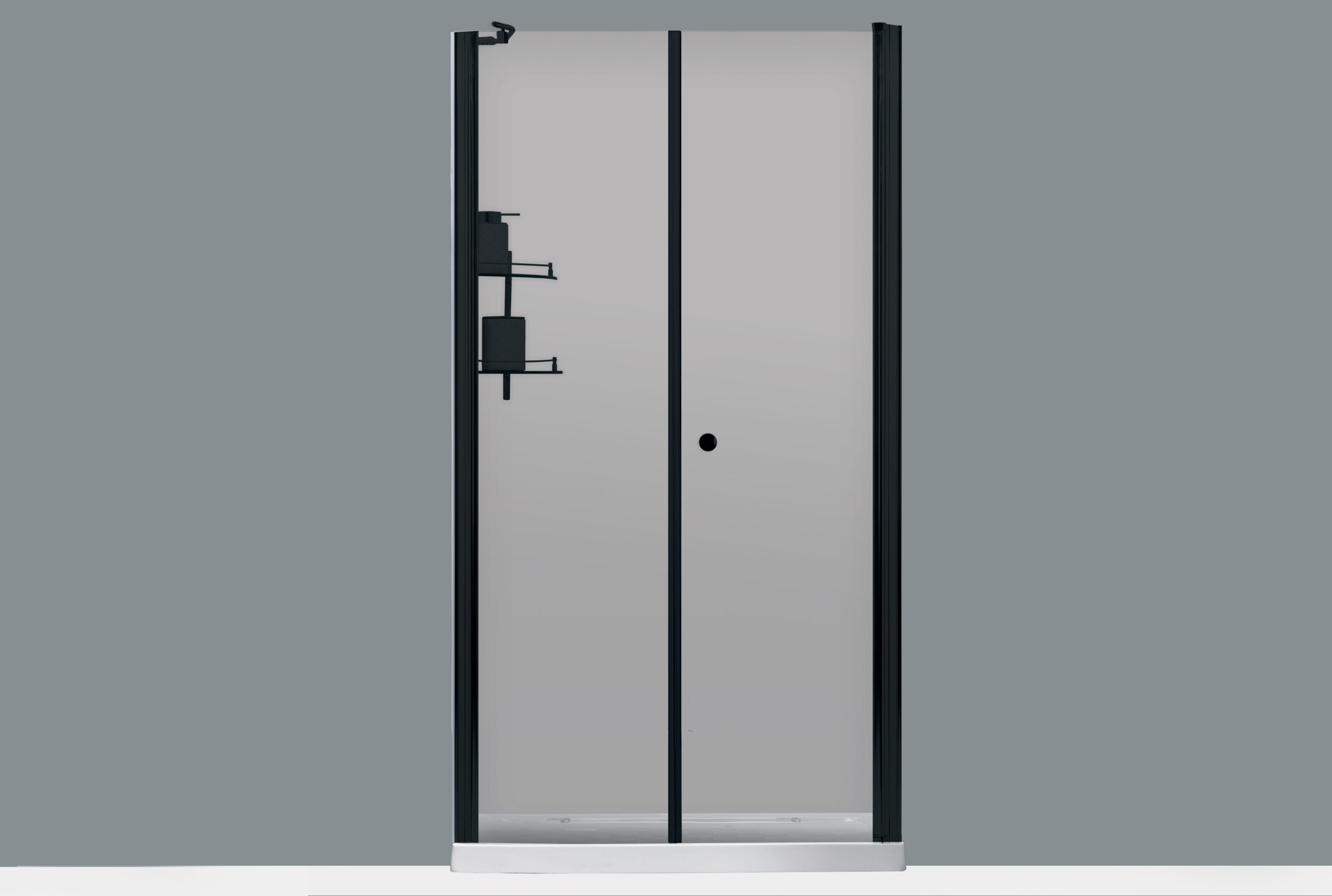 מקלחון חזית black model פרופילים- דופן קבוע+ דלת על ציר נפתחת פנימה והחוצה פתיחה מהאמצע.